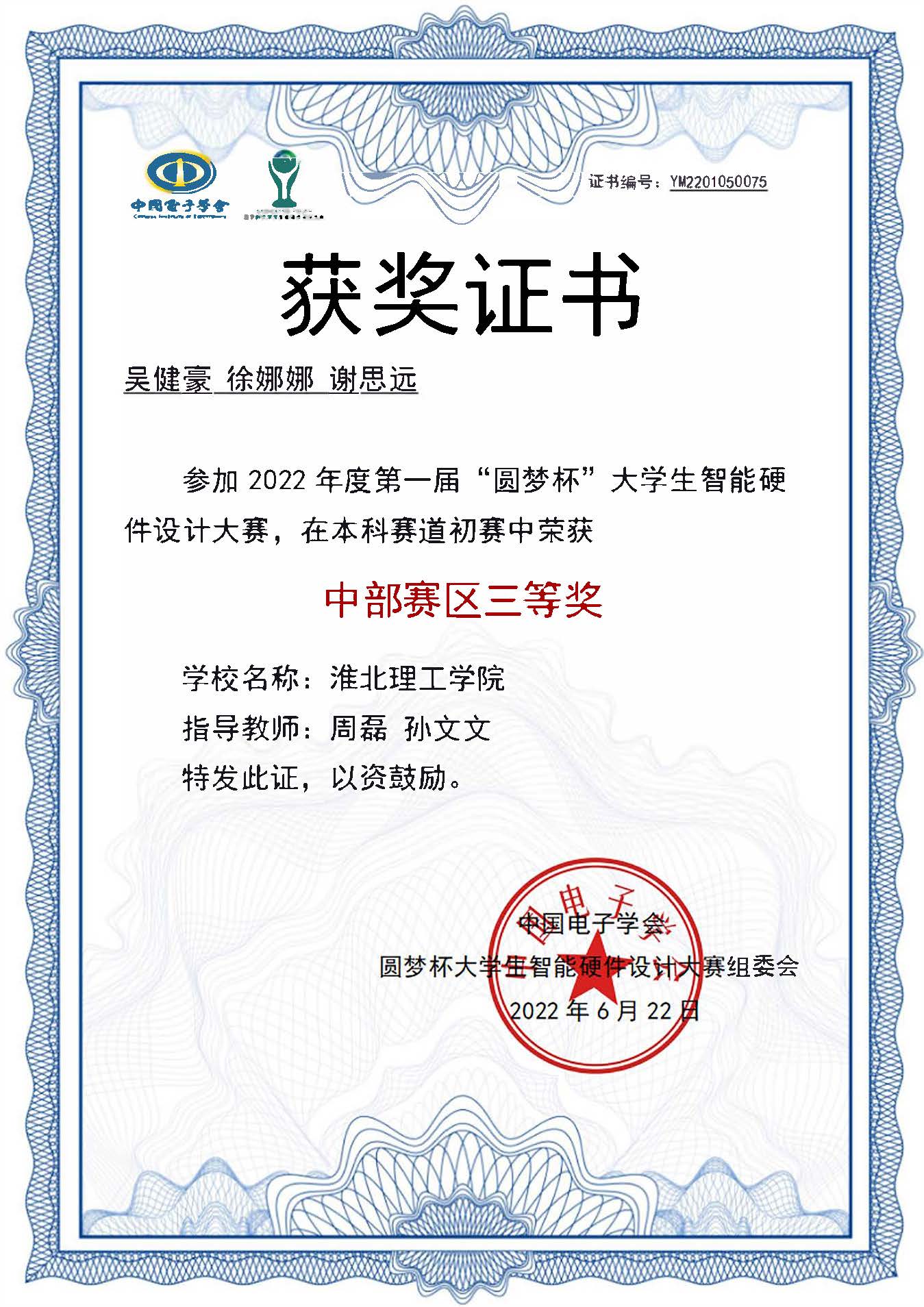 近日,由中国电子学会主办,北京航空航天大学、电子发烧友等单位承办的2022年第一届“圆梦杯全国大学生智能硬件设计大赛”的初赛落下帷幕。经过中部赛区(湖北、湖南、江西、河南、安徽)五个省份的激烈竞争后,beat365电子信息工程1班吴健豪、谢思远、徐娜娜同学组成的本科参赛小组荣获了中部赛区的三等奖。