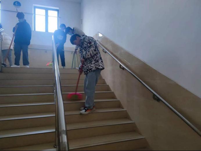 在进行简单的任务分配后,同学们被分为两大组,分别清扫教室和楼道。同学们用扫帚清扫教室地面垃圾、用拖把拖洗教室地面。努力做到教室地面无纸屑、无污水,墙面整洁、桌椅摆放整齐、桌洞无残余垃圾。在同学们的共同努力下,最终清扫教室工作圆满完成。