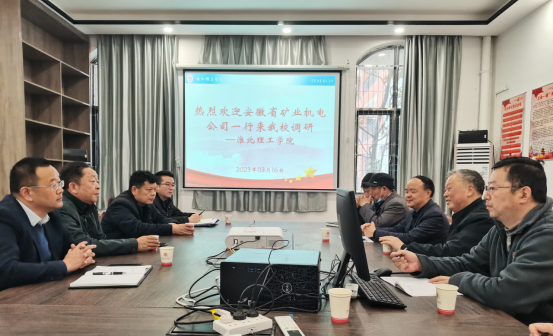 2023年3月16日上午,安徽省矿业机电装备有限责任公司李凤荣党委书记、董事长一行,来beat365进行校企合作调研,进一步落实校企合作。汪建利副校长、朱昌杰院长及相关专业负责人参与本次调研。