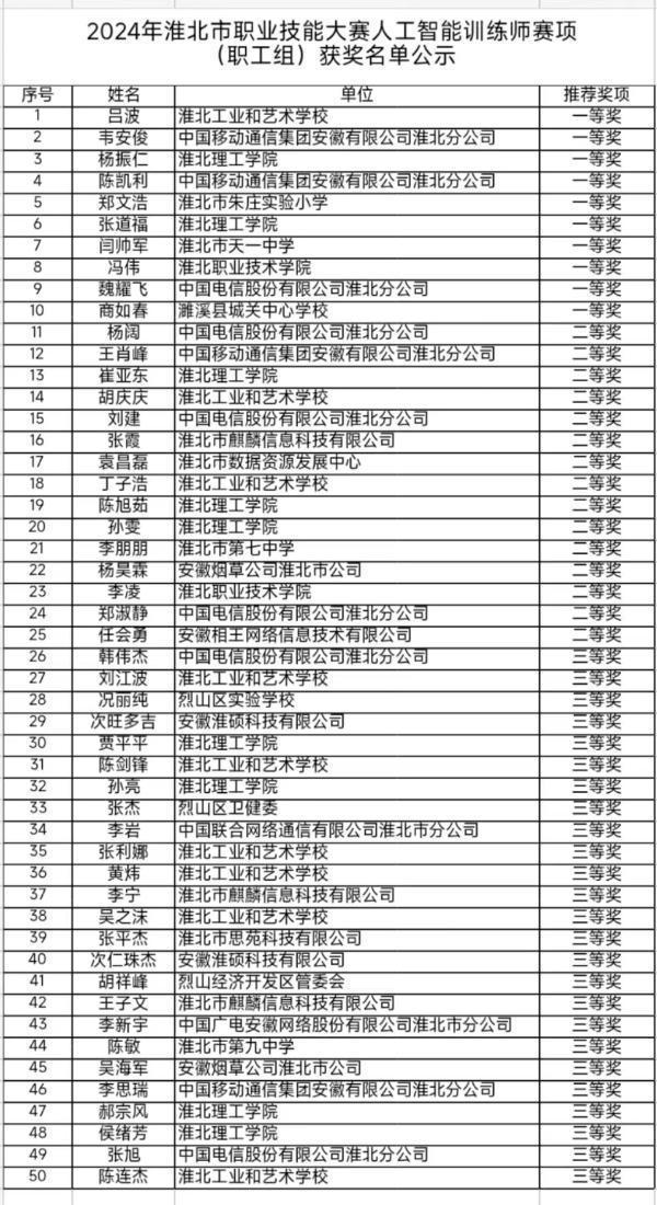 十一、2024年淮北市职业技能大赛人工智能训练师赛项竞赛,是为了宣传贯彻人工智能训练师国家职业技能相关标准,构建科学规范课程体系,开辟数字人才自主培养新赛道。促进企业人工智能训练师职业的技能提升,推动院校相关专业的人才培养创新改革,推动经济高质量发展提供坚实基础,营造劳动光荣、技能宝贵、创造伟大的社会风尚,为全面建设社会主义现代化国家提供有力人才保障。