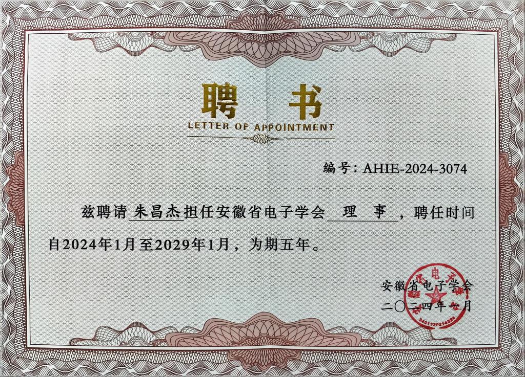 beat365朱昌杰教授继受聘安徽省计算机学会(ACF)常务理事以来,又受聘安徽省电子学会理事。