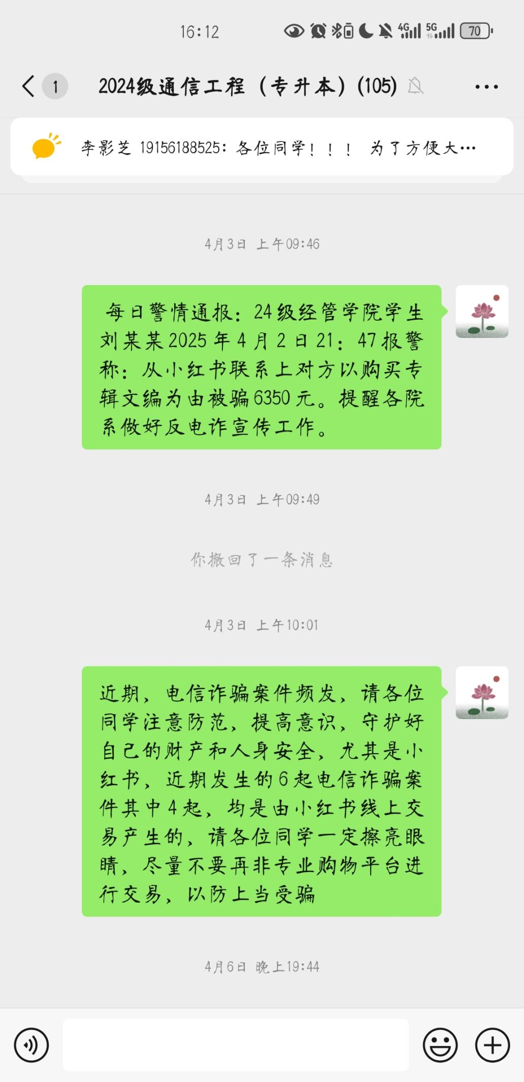 为了扩大防电信诈骗活动的影响面,学院还通过多种渠道进行宣传。利用微信等网络平台发布防电信诈骗知识和案例,同学们可以随时查看相关内容,进行自主学习。此外,各班还通过班级群、宿舍舍友群等方式转发防电诈信息,形成了全方位、多层次的宣传网络。