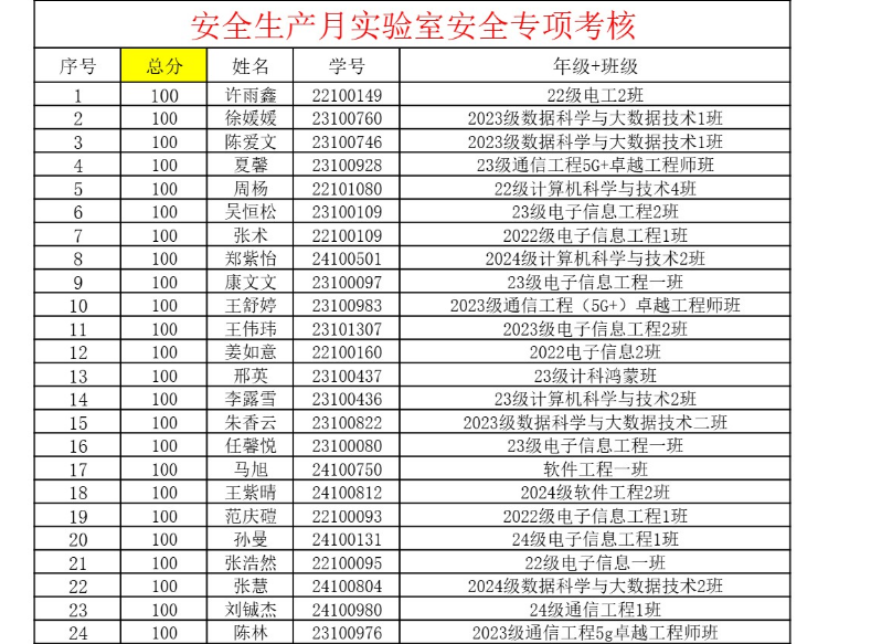 考核现场组织严谨有序,学生们全神贯注作答。在规定的截止时间前,共有64名同学顺利完成测试。最终成绩单显示:64名参测学生全员高分通过!其中24人斩获满分(100分),90分以上占比超过95%(61人),充分展现了学院常态化安全教育的扎实成效和学子过硬的安全素养。