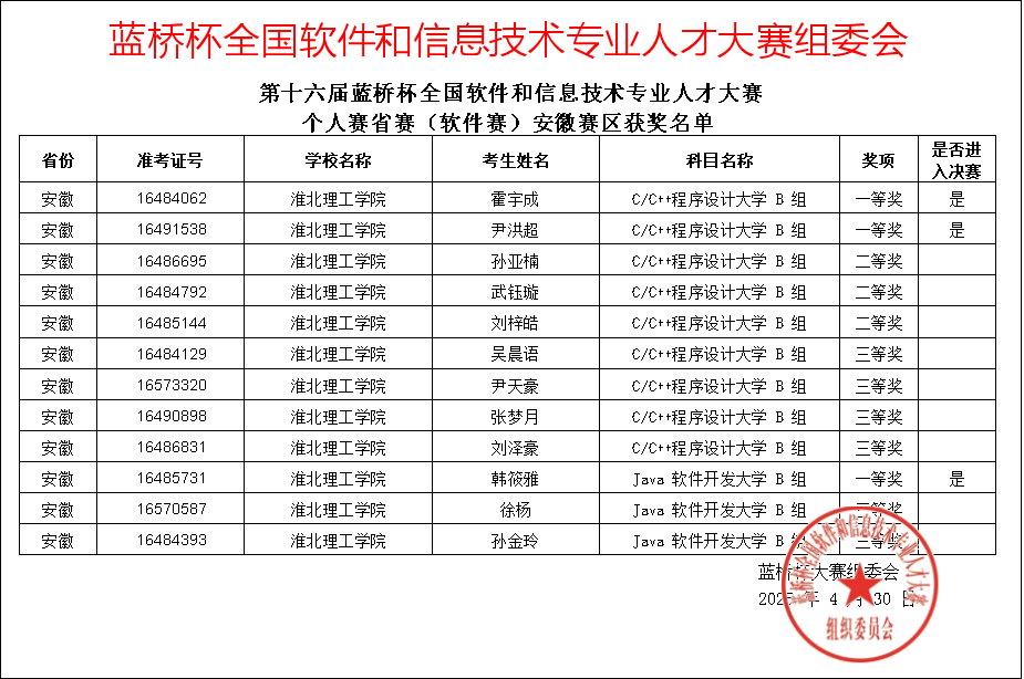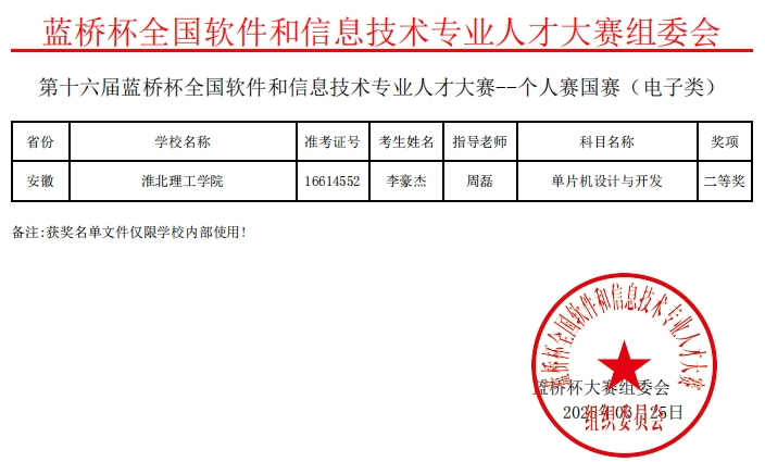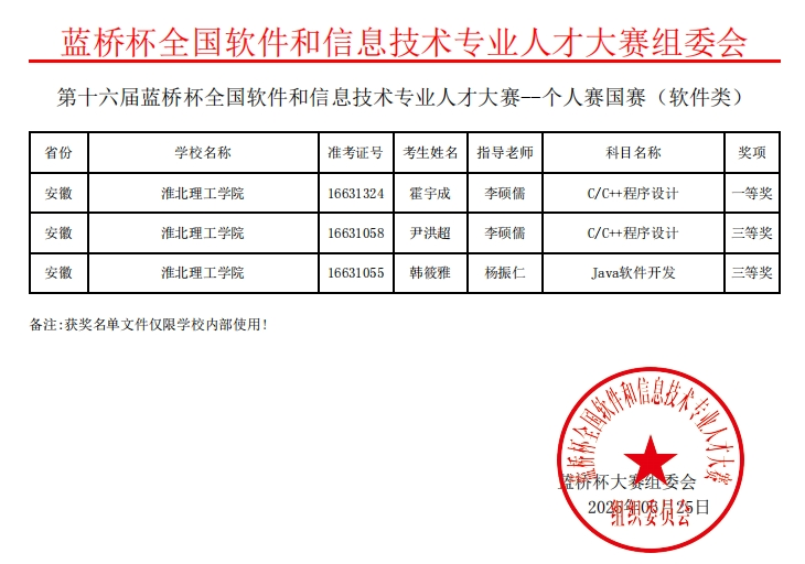 beat365beat365在线唯一官网学子凭借扎实专业功底在第十六届“蓝桥杯”全国软件和信息技术专业人才大赛全国总决赛中,获国家一等奖1项、国家二等奖1项、国家三等奖2项;在第十六届“蓝桥杯”全国软件和信息技术专业人才大赛安徽赛区,获省级一等奖4项、省级二等奖14项、省级三等奖13项。