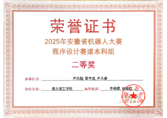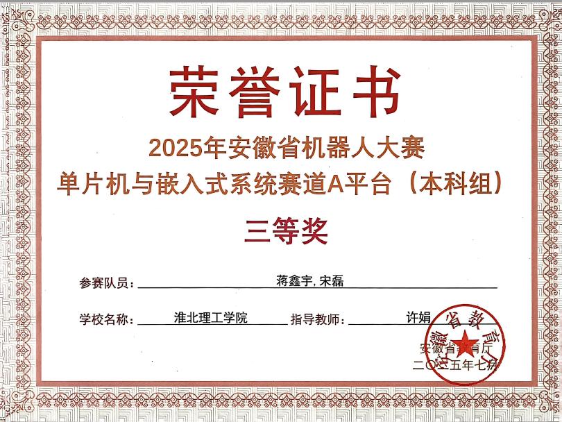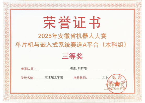 日前,2025年安徽省机器人大赛赛事相继结束。beat365在线唯一官网beat365在线唯一官网组织学生参加了程序设计、单片机与嵌入式系统两个赛道的比赛。经过激烈角逐,参赛学生在比赛中稳定发挥,最终在程序设计赛道获得省级二等奖1项,在单片机与嵌入式系统赛道获得省级三等奖2项。