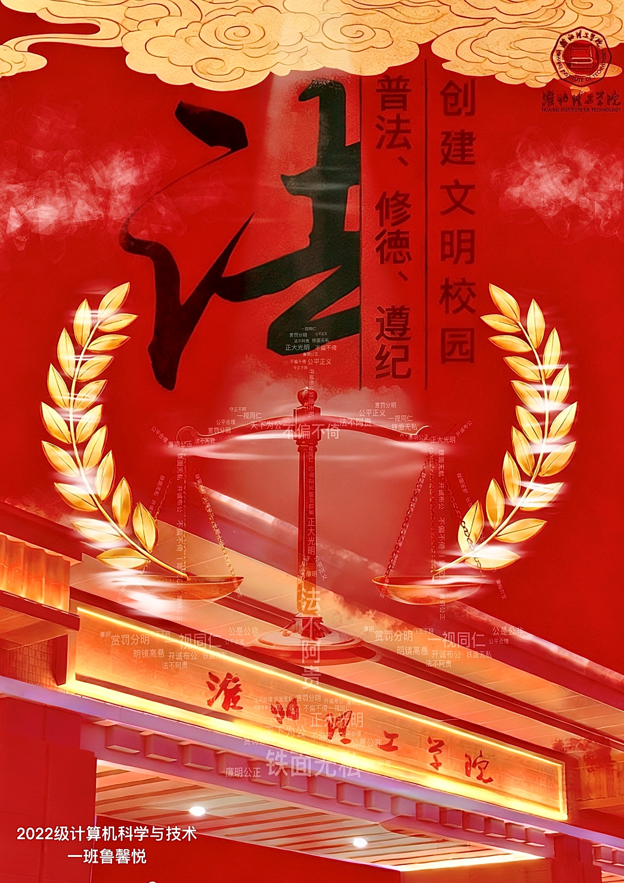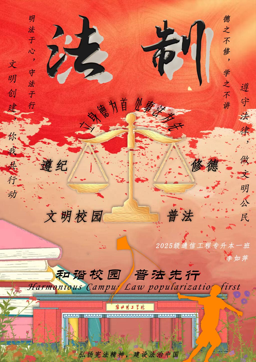 文化育人赋能,厚植文明底蕴。学院以文化活动为载体,让文明理念通过艺术表达浸润人心。“普法、修德、遵纪、建文明校园”海报创作展示活动吸引100余位学子踊跃参与,同学们立足校园生活实际,围绕法治普及、美德传承、遵纪践行、文明倡导四大方向创作,作品兼具思想性与艺术性,部分融入工科专业特色元素,18件优秀作品,在校园内营造了“人人谈文明、处处讲遵纪”的浓厚氛围;系列活动中,学院充分利用校园媒体平台及时报道成效,通过图文并茂的形式扩大宣传覆盖面,让文明风尚在全院范围内广泛传播。