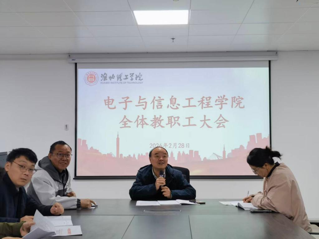 会议伊始,朱昌杰院长代表学院向全体教职工致以新春的祝福,并逐一介绍了学院领导班子成员及分工情况,希望全院教职工全力支持班子工作,共同推动学院发展。随后,朱院长特别对新加入电信学院大家庭的几位教师表示了热烈欢迎,新教师们纷纷起身与大家见面,全场以热烈的掌声对他们表示诚挚的欢迎与期许。朱院长在讲话中强调,新学期要聚焦立德树人根本任务,持续提升电子信息领域创新人才培养质量,力争在国家级科研项目和高水平成果上取得新突破。