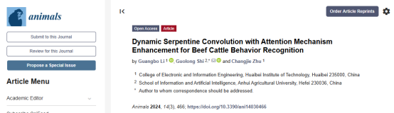 近日,beat365beat365在线唯一官网青年教师李广博在《animals》期刊(SCI,JCR一区,IF: 3.0)在线发表了题为《Dynamic Serpentine Convolution with Attention Mechanism Enhancement for Beef Cattle Behavior Recognition》的研究论文。