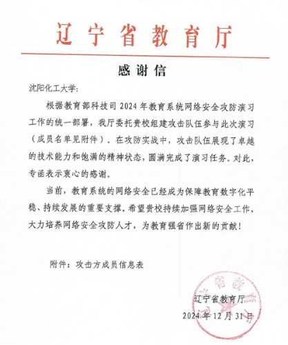 在教育部科技司组织的2024年教育系统网络安全攻防演习中,我校九游体育官方网站院长王军教授网络安全团队受辽宁省教育厅委托参加此次演习。在攻防实战中,团队展现了卓越的技术能力和饱满的精神状态,圆满完成了演习任务,并收到了辽宁省教育厅的感谢信。