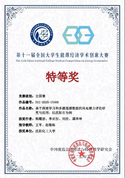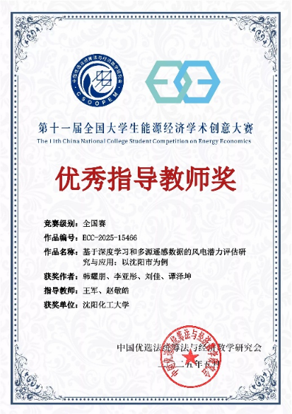 第十一届全国大学生能源经济学术创意大赛总决赛在5 月 24 日至 25 日举行。我校研究生韩耀鹏等学生的作品《基于深度学习和多源遥感数据的风电潜力评估研究与应用:以沈阳市为例》成功进入终审决赛,在激烈角逐中最终斩获全国研究生组特等奖。该作品由我校九游体育官方网站王军教授和中国科学院青岛生物能源与过程研究所田亚峻研究团队的赵敬皓工程师联合指导,是我校在该大赛中取得的历史最高奖项。