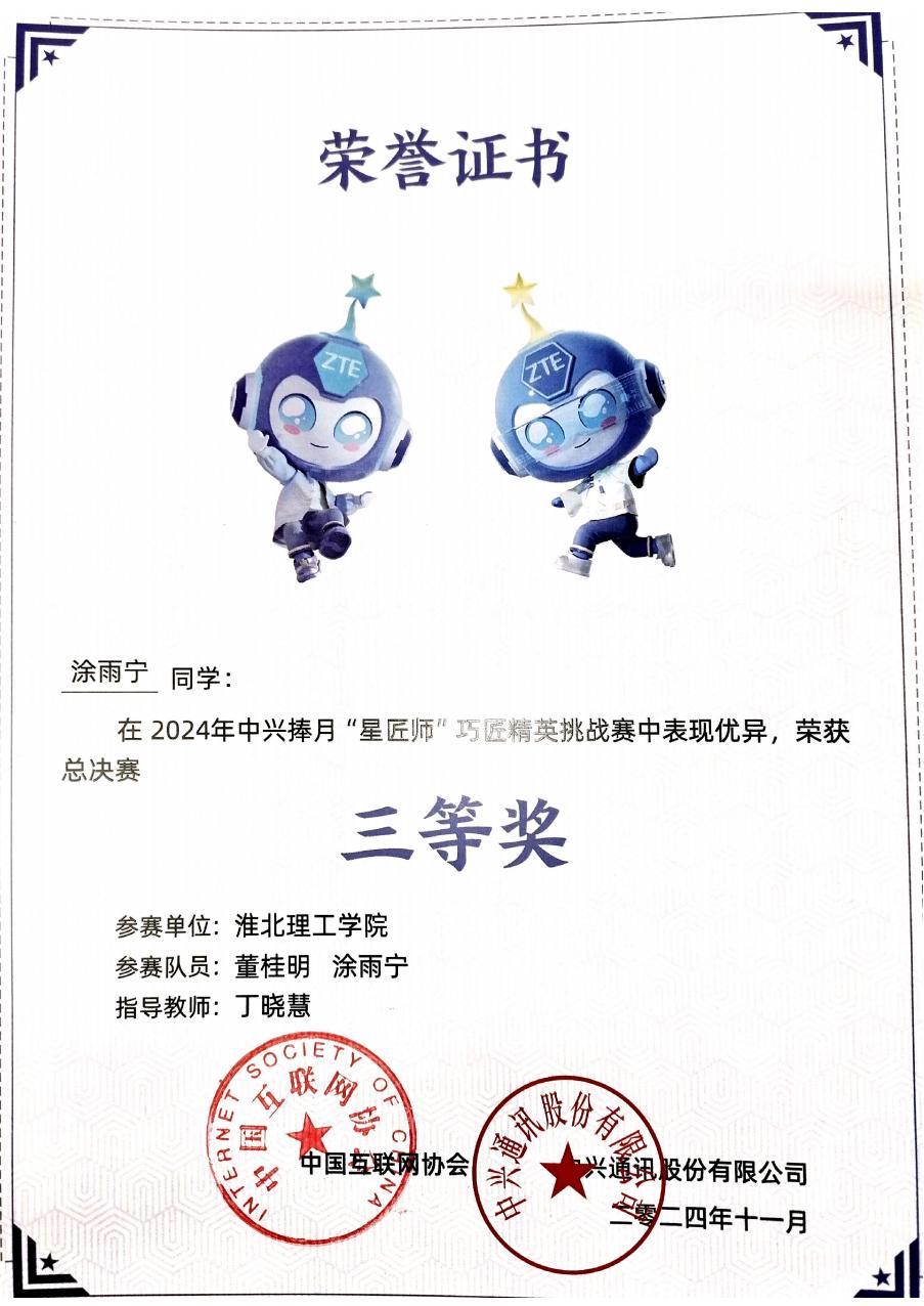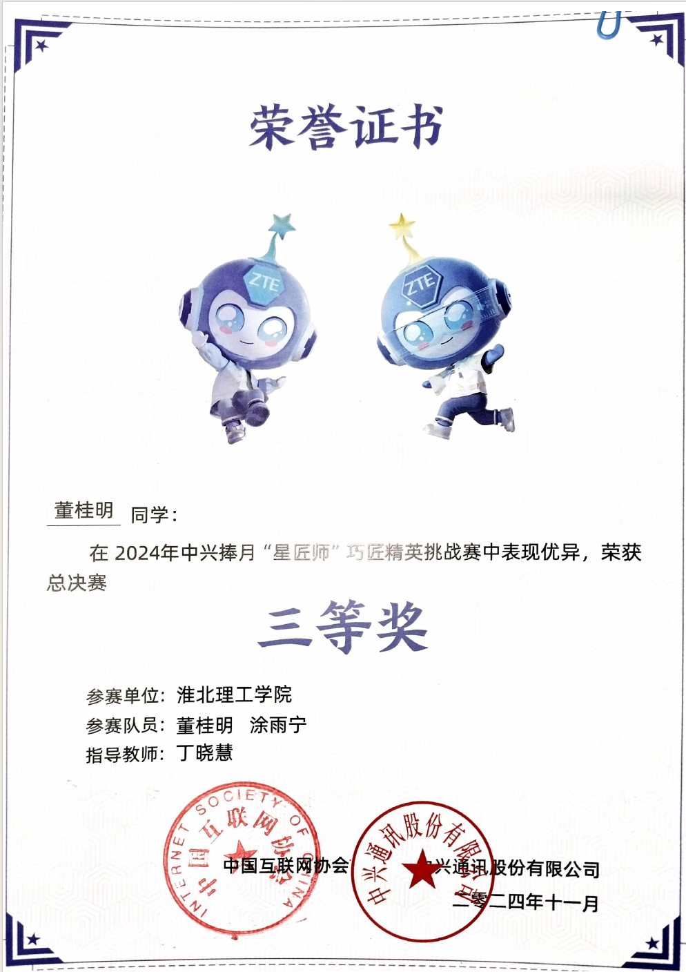 2024年10月27日,第十四届中兴捧月“星匠师”巧匠精英挑战赛全国总决赛在东南大学落下帷幕。本次大赛由中国互联网协会与中兴通讯主办、东南大学承办,旨在面向5G新基建培养具备扎实理论知识和实践能力的应用型人才。beat365首次组织学生参赛,大赛实行“省级初赛+全国决赛”模式,beat3654名学子组成2个团队与来自全国215所院校的627个团队参与角逐,最终2021级通信工程专业的董桂明、涂雨宁同学在省级比赛中顺利晋级,在全国决赛中荣获三等奖及1000元奖金的佳绩。